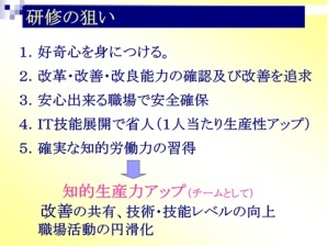 (3) 環境安全・生産性・品質及び職場制度の改善(創造的業務)を通じて企業活動に参画している当事者意識を高め現場管理体制の強化に寄与する人材を育てる。研修を受講し実践することにより、具体的には以下の能力が身に付き向上することで、この研修の目指す研修目標に達したと考える。