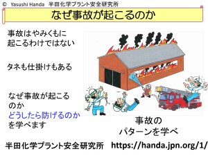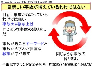 事故は繰り返すという言葉があるように、10~20年ごとに同じような事故が繰り返し起こっている。過去に起こった事故事例は、貴重な教訓を我々に与えてくれている。大きな事故であればあるほど多くの原因が組み合わさっている。大きな事故は、原因の一つでも取り除いていれば防げたかもしれないということを物語っているのである。多くの事故に共通する、「事故がおこる基本的なメカニズム」を理解しておくことは化学プラントの事故防止には重要である