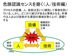 人(知識不足、誤認識・判断)、技術(設計、化学反応)、および静電気が主要な要因の事故について深掘りして学び、事故防止の着眼点、方策について考え、事故を未然に防ぐことの出来る保安人材を育てる。